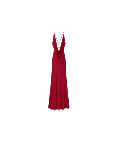 Abito lungo smanicato con profondo scollo drappeggiato sul davanti e scollo a V sul retro.