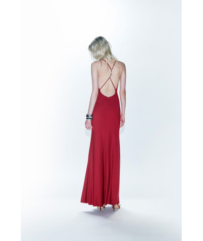Abito lungo smanicato con profondo scollo drappeggiato sul davanti e scollo a V sul retro.