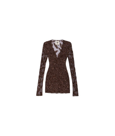 Mini abito a maniche lunghe con scollo a V in tulle ricamato con motivo di paillettes floreale