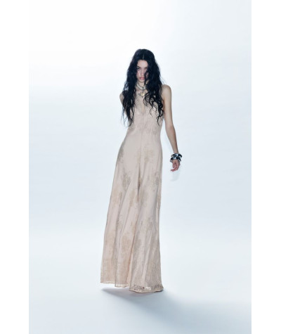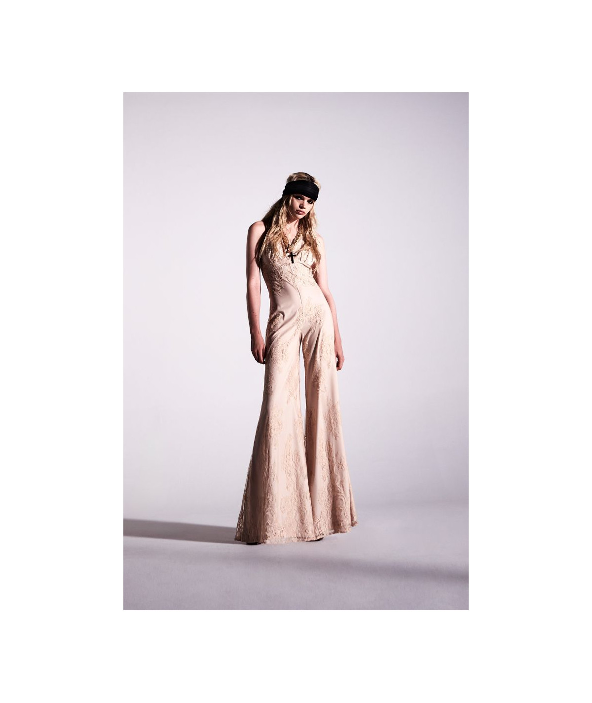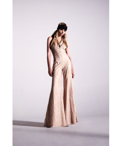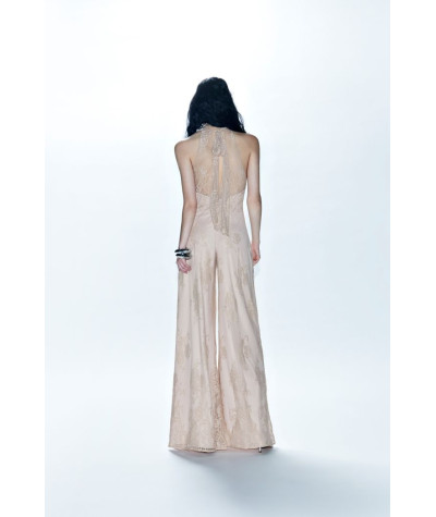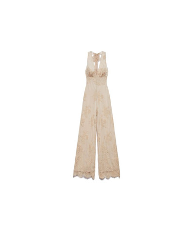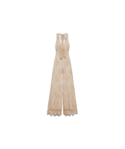 Tuta lunga in pizzo con scollo all'americana e ricami all over