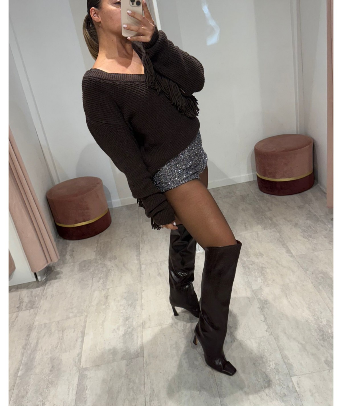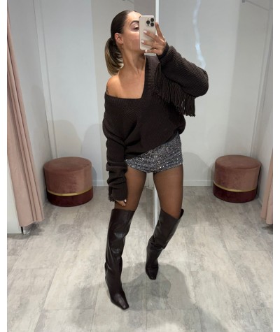 Gli short Luxy realizzati interamente in paillettes, scivolano sulle curve come una seconda pelle, evocando l’eleganza sfacciata delle coulotte da palcoscenico. La fodera interna garantisce comfort e libertà di movimento, mentre la lunghezza ultra mini accende l’immaginario da night-out.