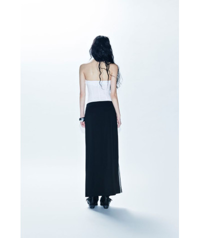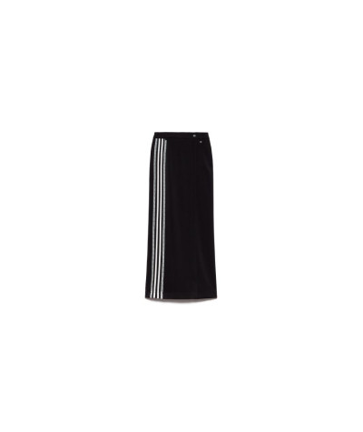 Gonna lunga con chiusura a portafoglio e dettagli laterali.