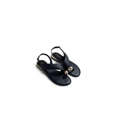 Sandali piatti in pelle con rifiniture metalliche dorate. Anello gioiello. Presentano soletta imbottita e cinturini regolabili alla caviglia. Tomaia, fodera e soletta in pelle. Suola flessibile in TPR.