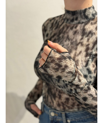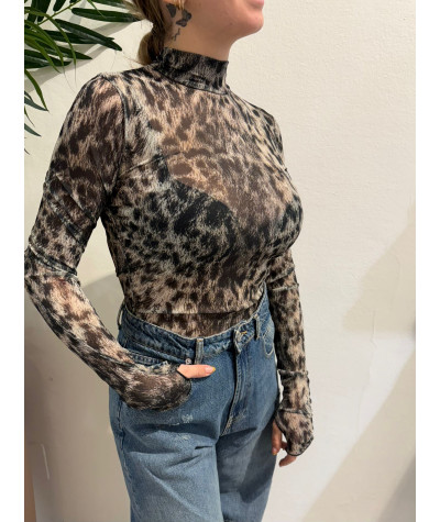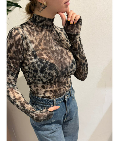 Il body Judy è una dichiarazione di femminilità wild. La stampa animalier all over cattura lo sguardo, mentre il drappeggio sul busto disegna volumi mirati e sofisticati. Il collo alto aggiunge un tocco grafico e deciso, bilanciato dalla morbidezza del tessuto stretch che aderisce come una seconda pelle.