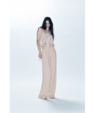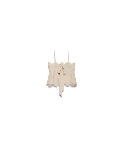 Top corto in pizzo con scollo a fascia e spalline sottili regolabili.