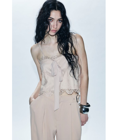 Top corto in pizzo con scollo a fascia e spalline sottili regolabili.